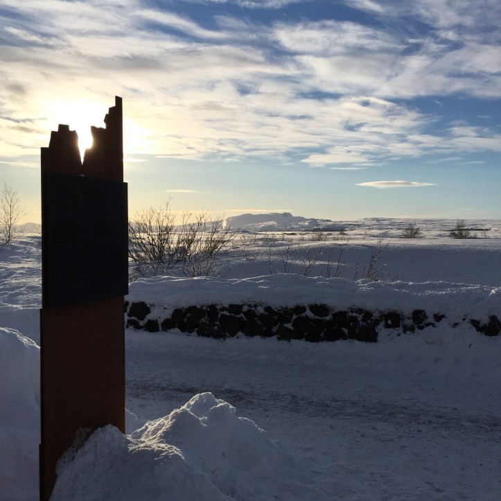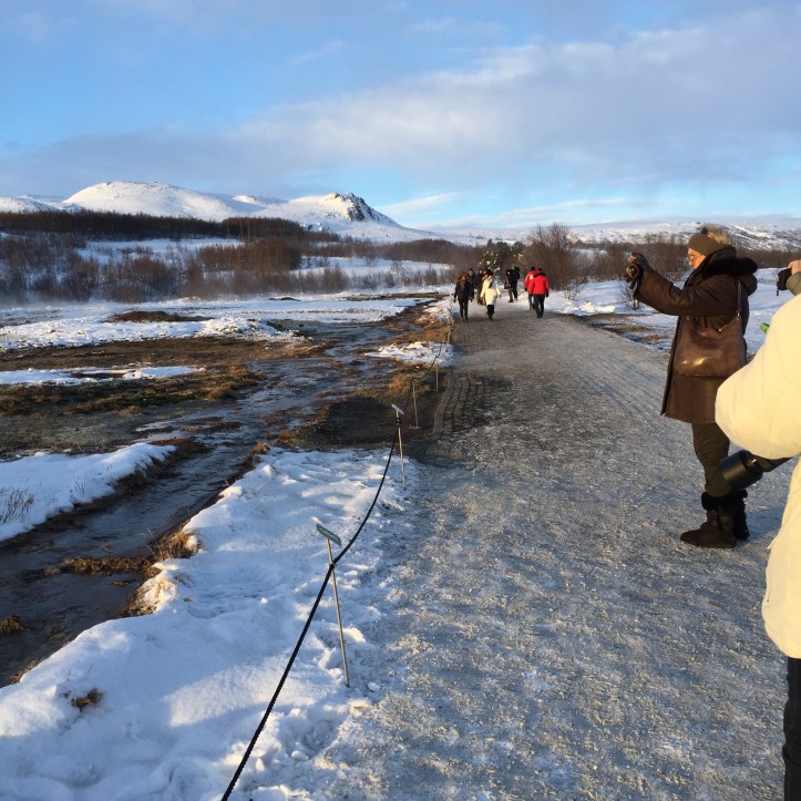 Luckily, it would only be a half day tour. Very relaxed. Very beautiful. I only fell asleep once or twice. Our small van took about 15 passengers north, out of Reykjavik, and on a shortened version of the Golden Circle – a tour that usually takes all day. Because I was only semi-cognizant of place names and such, I’ll just show you a few pictures. First we visited Thingvellir National Park. (Just wait. The names get longer and stranger with each day that passes). It’s a broad, sweeping plain which was the site of historic yearly gatherings of all the Viking chiefs plus is geologically significant as a place where the North American and Euro-Asian tectonic plates come up against each other. It was really VERY cool. I kept thinking how my friend Maria’s husband, a geologist, would enjoy seeing it. But even someone so geologically ignorant as me could be awed by the recognition of such a place.