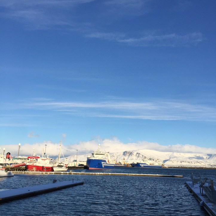 Then I walked some more. I was walking all the way down to almost the end of the peninsula. I had seen a listing of all the museums. The Saga Museum, about Vikings, seemed like it would be unusual and interesting. On the way, I wandered through the harbor. Even in the freezing cold weather, crews were out building and repairing large commercial sea craft. Restaurants and shops line the area. Not too many folks out that day though! But I can imagine in summer it’s busy, busy, busy.
