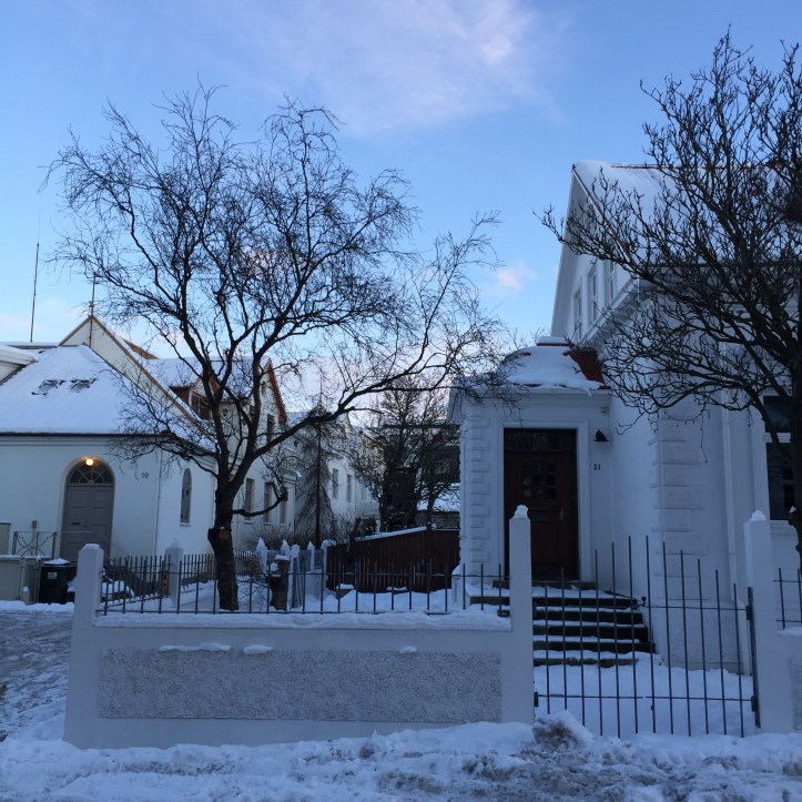 I found an interesting mix of apartment buildings and stand-alone houses, apartment blocks and older buildings which looked like attached homes. Surprisingly, almost all the buildings were white. Occasionally I would come across a shade of grey from barely there to almost black. But very little color. I used to think of Tel Aviv as “the white city” because much of it was built in the same era using the newly modern International style of white buildings without ornament. I soon began to think of Reykjavik as “the white city” too. The Reykjavik neighborhoods, with predominantly white buildings, did still display tiny flourishes of ornament in ironwork, doors, windows and sometimes parks. The prevailing color I saw aside from the white to black spectrum was red. Not a cherry or fire-engine red, but rather a deep red, reminiscent of old, baked bricks and deep red tomatoes.
