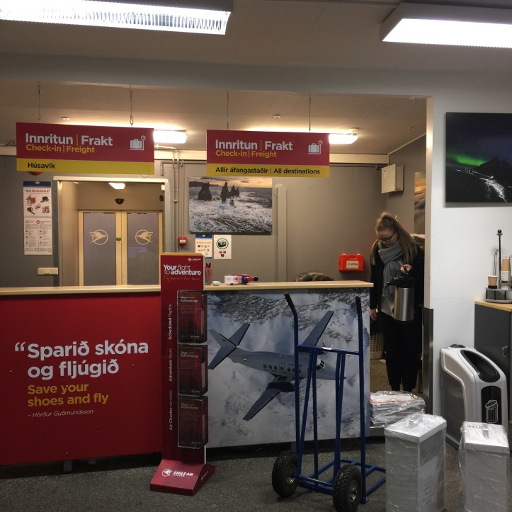 We arrived at a tiny airport in Reykjavik at about 8:00 am. (Had to stop a t a few hotels for pickups). It resembled the airport in Santa Fe – a small waiting area, two gates, people nodding at each other as they recognize the regular travelers on the route. About 25 of us sat and waited.