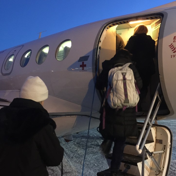 We got up to board our tiny plane and zoomed off (literally, you could hear the zoom on a plane that size). I watched us leave the city and soar above the vast white nothingness once again. Boarding the plane and flying over the arctic landscape again bringing my family’s time in Alaska to mind. We have slides upon slides in the family collection of small planes, people in parkas, and snow covered mountains stretching endlessly into the distance. Even a few of mom’s paintings recall the landscape of that place. (Viewing available at Anna and Joe’s house.)