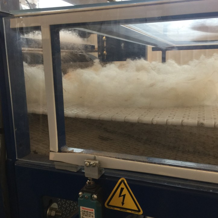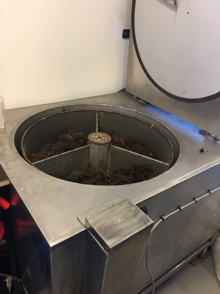 I was taking pictures, got as far as the scouring and picking (which opens up the fiber and prepares it for carding), then completely abandoned my job of taking pictures. I was deep in conversation. I had a million questions for Hulda. And frankly. I find it fascinating. I am absolutely enraptured by any process that works with this material and turns it from something off a sheep’s back (or alpaca’s back or cashmere goat’s back or… you get the idea) into this stuff called yarn, from which we can make clothes and blankets and carpets and a hundred other useful things. Plus I love the smell and the wonderful squishy feel of newly-created skeins of yarn in my hands. A chocolate lover at a chocolate factory couldn’t be happier. I mean it. It’s pure glee.