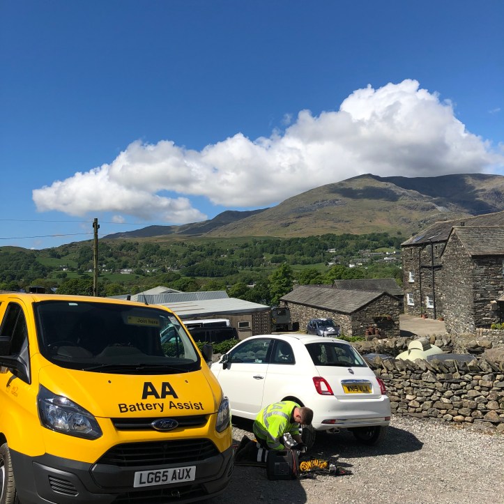 Well, donut time… and then our AA guys is going to follow us into nearby Kendal (30 minutes) where we can get a new tire. We were going to meet early arrivers for the next tour at the hotel in Edinburgh for a drink… I think that’s out. But I’m confident we’ll get to Edinburgh tonight in time to meet everyone else arriving at the airport in the morning.