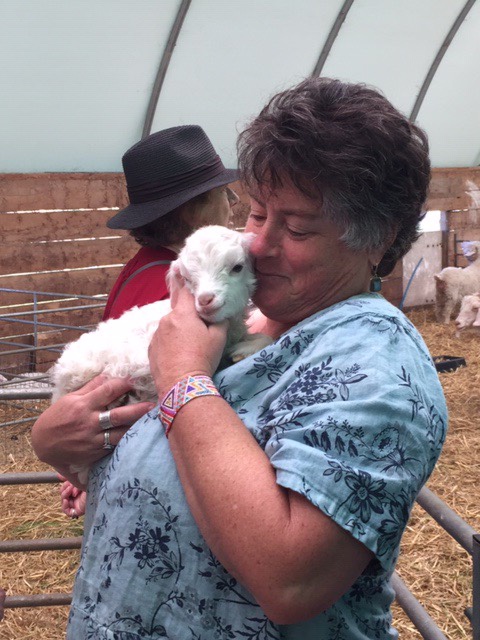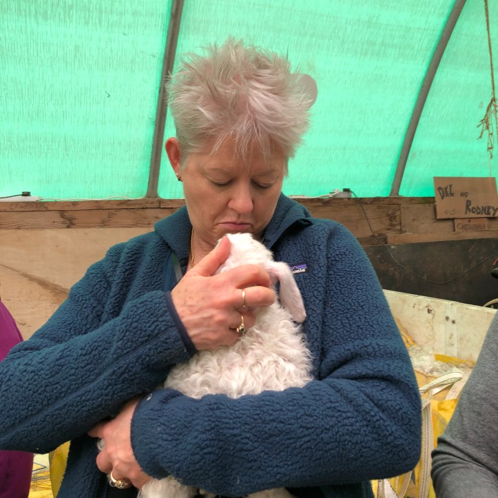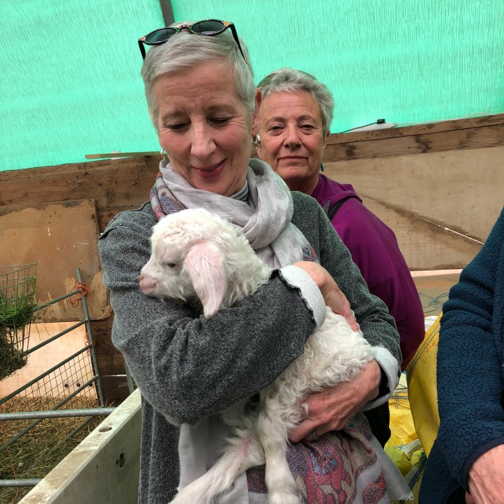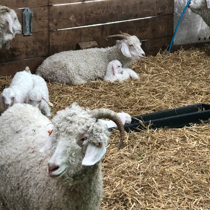 Whistlebare is the home of many, many well-taken-care -of angora goats, a flock of lovely Wensleydale sheep, and a passel of yarns made from their own and nearby farms’ harvested wool. Our hostess, Alice, owner, dyer, designer and chief angora shearer, took us right out to the barn to see the spring crop of kids. I was not the only one in heaven.