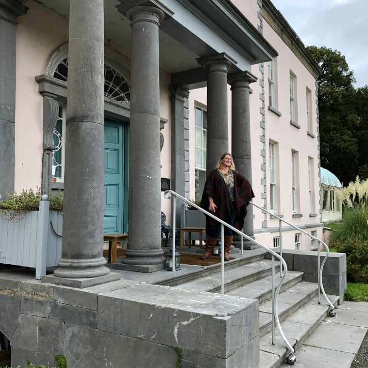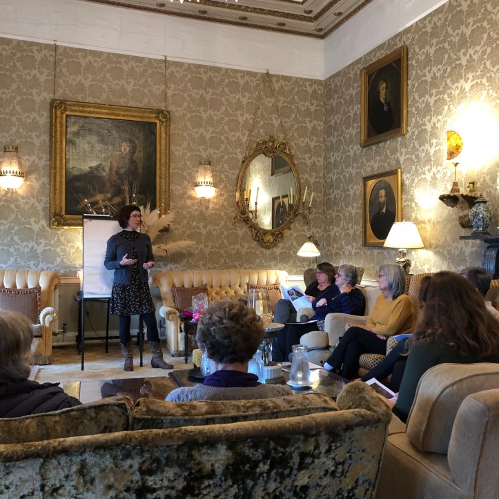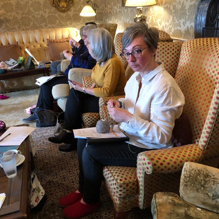 We stayed at Longueville House for three delightful nights. On day two, we were joined by Irish knitwear designer Carol Feller. Put together a warm and elegant setting, a fantastic teacher, and a group of enthusiastic knitters and you have the makings of a great time. Carol is the author of several knitting books, including Contemporary Irish Knits and Echoes of Heather and Stone. I had heard her name and seen many of her designs via social media. She has a large following in the knitting world. I saw her at Edinburgh yarn festival last year. Unfortunately, her booth was so jammed with people that I didn’t even try to get in. What a treat to have her for two mornings of workshops! I found Carol to be warm and genuine, full of mischief and very willing to laugh at herself and this strange knitting thing we all do. I kew I’d like her right away when, on the first morning, I found her setting up for the workshop wearing a comfy tunic, leggings and cowboy boots!