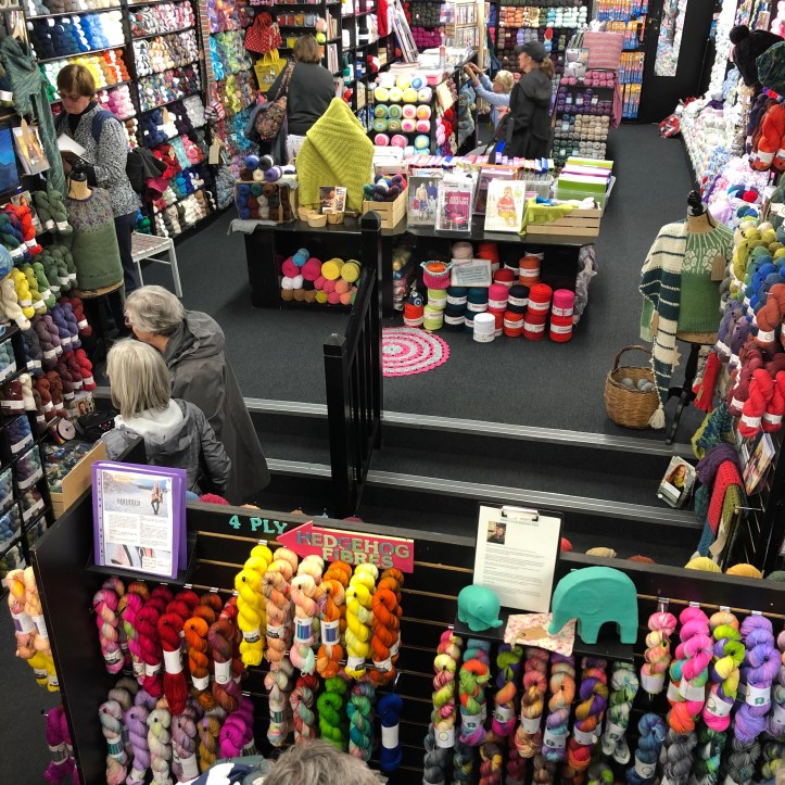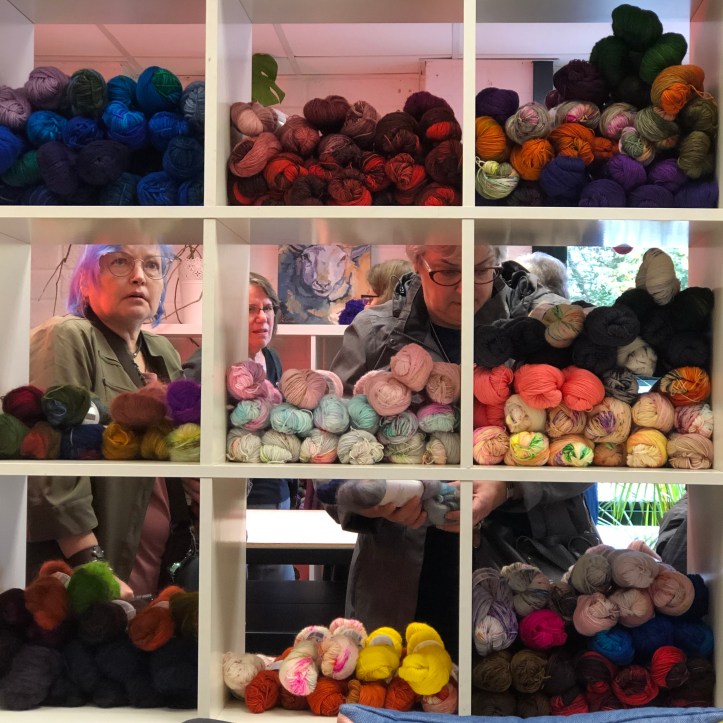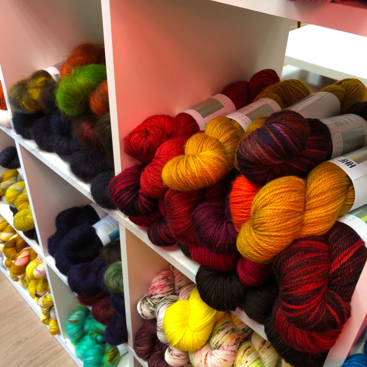 The afternoons were spent visiting Blarney Castle and Mallow (skipped that to sit and catch up on work. Don’t worry. I’ll have the opportunity to kiss the stone on spring trips.) Another afternoon, we went into Cork city to visit Hedgehog Fibers, Vibes & Scribes and wander the town a bit. For you non-yarny types, Hedghog Fibres is a dye studio, started by Beata Jezek. As you can guess from her last name, she is not from Ireland. However she now calls Cork home and has quite a wonderful cottage business set up here and employing several folks (always an astounding feat for any craft business). HHF is known for wild color combinations, specked dye patterns and saturated dyework. The group went a little crazy…