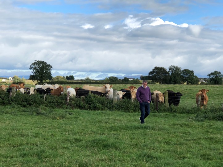 Oh, I forgot to mention that the afternoon I stayed in to work, the group also visited a nearby farm — one of the wool suppliers for the Vibes & Scribes (actually) Irish yarn. Because the farmer keeps sheep for the organic meat market, he’s able to supply wool to Joan for her yarn endeavor. I believe he keeps Texel and Suffolk, as most Irish farmers do, but also a Kerry Hill or two and some Blue Faced Leicester. Hey, are those WOOL sheep breeds I’m mentioning? Yes they are. But keeping sheep for wool production is as uncommon here as hearing Yiddish. I mean someone might be doing it. But if so, you don’t hear it in public. Farmers here grow sheep for meat. Period. But again, more on that later… Here are some nice pics from that visit, shared by Heather. There’s our driver, Raymond, after happily visiting with the farm cows. He loves cows. he keeps cows, even though he says farming in Ireland is “finished”. It’s not for lack of love he says that, but for the great difficulties all farmers here face in trying to earn a living from farming. The deck is stacked against you. Most have one or two adults working off the farm to support it. Sounds a lot like farming everywhere, including the States. However, those that do it love it and those that can find a way to make it work get to be involved with their land and animals every day. Our visits and direct purchase of their produce – at home and abroad – help.