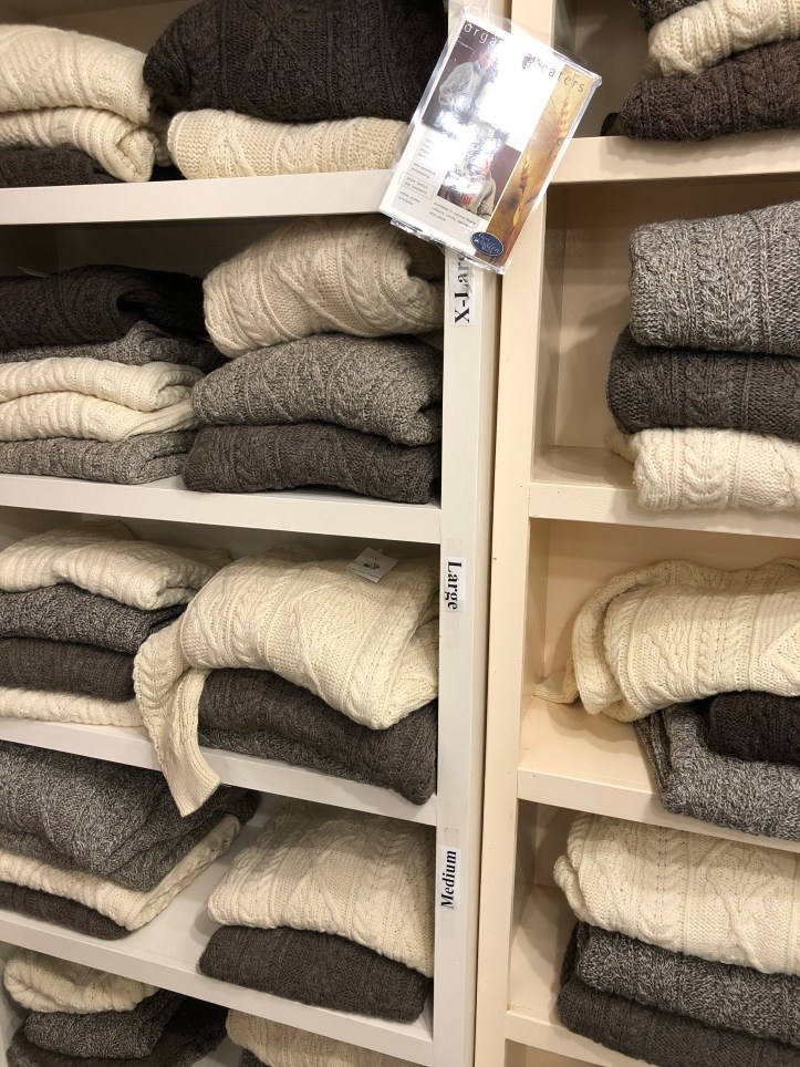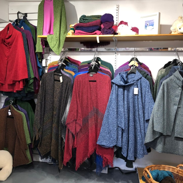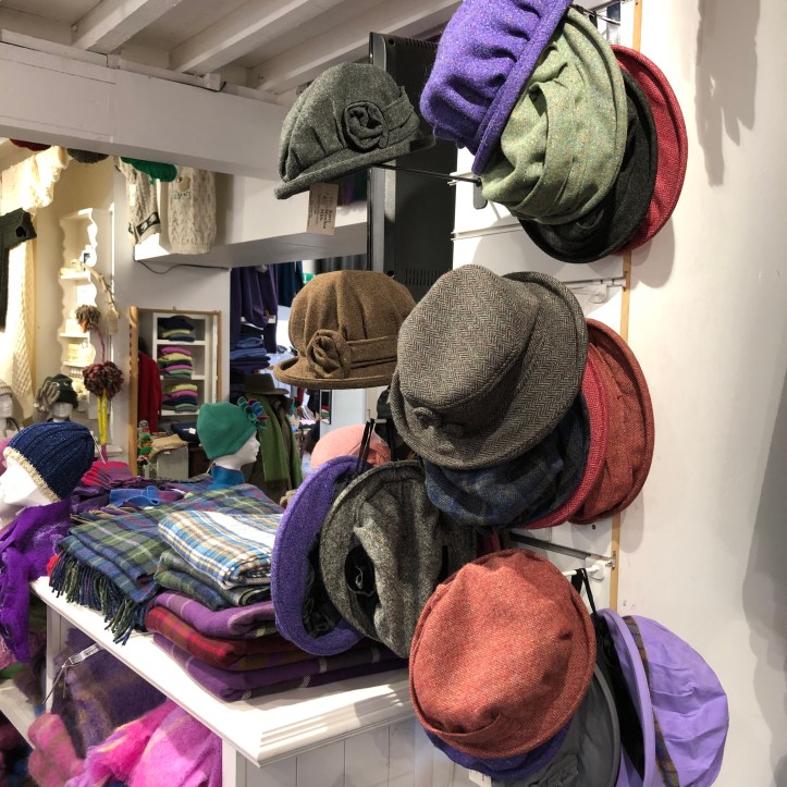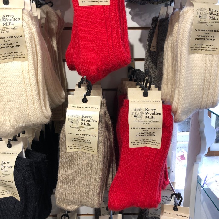 Several crazy moments of trying to drive in a town again and then I found a place to park, my hotel and had lugged my (now seriously heavy) suitcase up to my room. Over the next couple days, I kicked around Killarney, both walking the town and driving in the area. My first morning I just wandered, getting to know the layout and the feel of the place. In the afternoon, I had an appointment to go visit Kerry Woolen Mills, about a half hour away. Another amazing find! Different from Cushendale in the north in that it was much larger and seems to create a wider range of yarns and textiles. I met with one of the owners,Yvonne, who generously showed me around the place following the order of wool’s arrival at the mill (cscoured and in large bales), through fluffing, dyeing, color mixing, carding into pencil roving, spinning machines and on to the weaving looms. In fact, they also produce sweaters on huge knitting machines, but not at the County Kerry location. We also had quite a frank talk about the use of Irish-grown wool (“We can’t use more than 50% Irish wool because people won’t wear the stuff. Also, we have no scouring facility here. Irish wool from has to be shipped to northern England for scouring and then back again.”) and how Brexit is going to affect the few mills and producers in Ireland. I appreciated the effort that Kerry Woolen Mills has made and continues to make to produce authentic Irish textiles. They are family owned – Yvonne married into the second generation of current owners – and have been a local employer for hundreds of years. I’m happy to see the mill is robust, creative and flexible enough to sustain themselves in this modern world of fickle customers, complex trade and sourcing relationships, and political maneuvering. Their shop onsite was a delight. I spent a long time wandering around in it. You’d think after all the visits of the last few weeks I’d be sick of wool and woolen products. But these were of such fine quality, it was a joy to browse and handle everything from wool to cashmere to mohair. The shop offered their own products and a selection of goods made by other Irish artisans and textile producers. Worth mentioning: Kerry Woolen Mills has been part of an effort to create a county-wide craft trail that incorporates potteries, metalworkers, artists, etc. Sigh… So many makers, such limited time!
