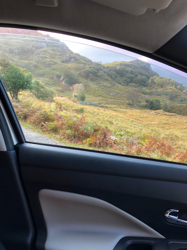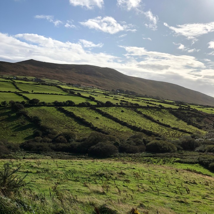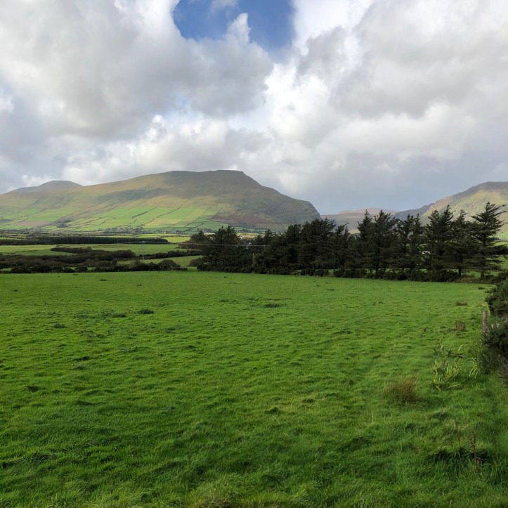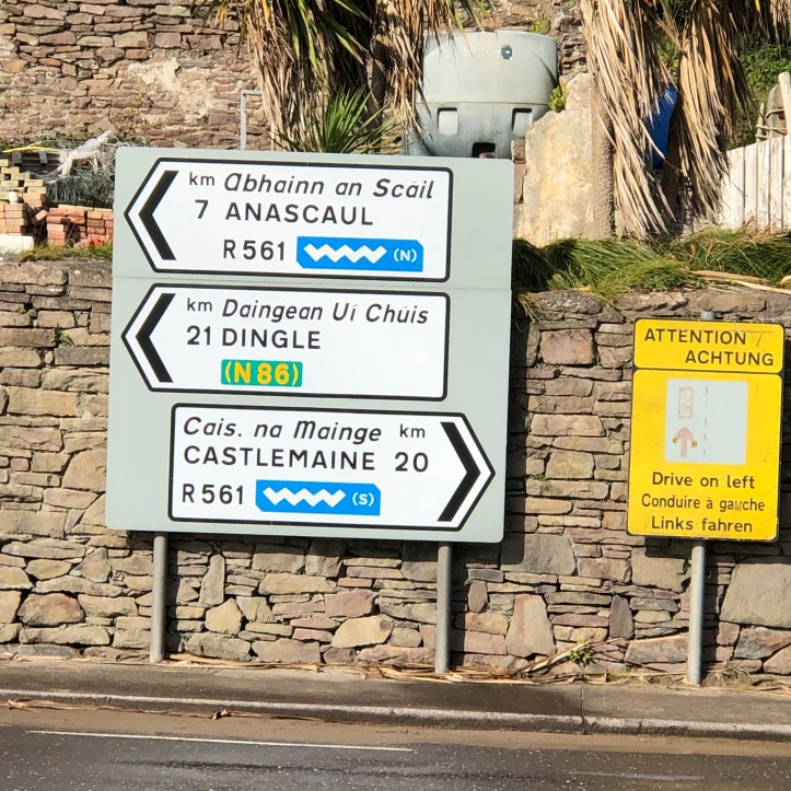 The next morning I was up early and ready for another adventure. Despite the rain, I was determined to drive either the Ring of Kerry or the road out to the Dingle Peninsula. I opted for the second. Turns out County Kerry is the place from which the Irish portion of the Sugrue family (including that name, which is quite common in this area) emigrated to America. The Sugrues are my ex-husband’s family. Their great-great grandmother(?) on their dad’s side came from Anascaul, just near the town of Dingle itself. I couldn’t come so near to the place and then not actually go there! It’s part of my kids’ heritage! Plus I’ve always been curious about it. From the maps, it looks like it’s right on the coast. I always pictured it to be a fishing village. In fact, as I’d find out later that day, my mental picture of Anascaul was completely inaccurate. It’s not by the sea but up in the mountains! Not a fishing village at all, but more agricultural and has the feel of a mountain town. Once again, Ireland surprised me by being not what I pictured, but something entirely different…