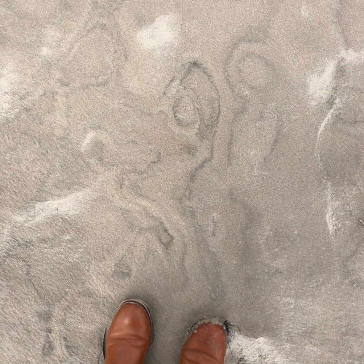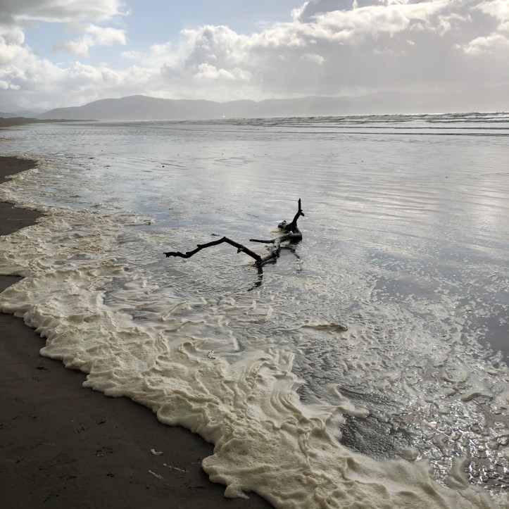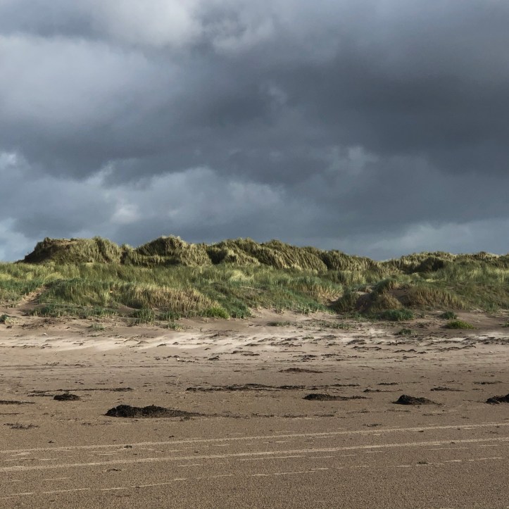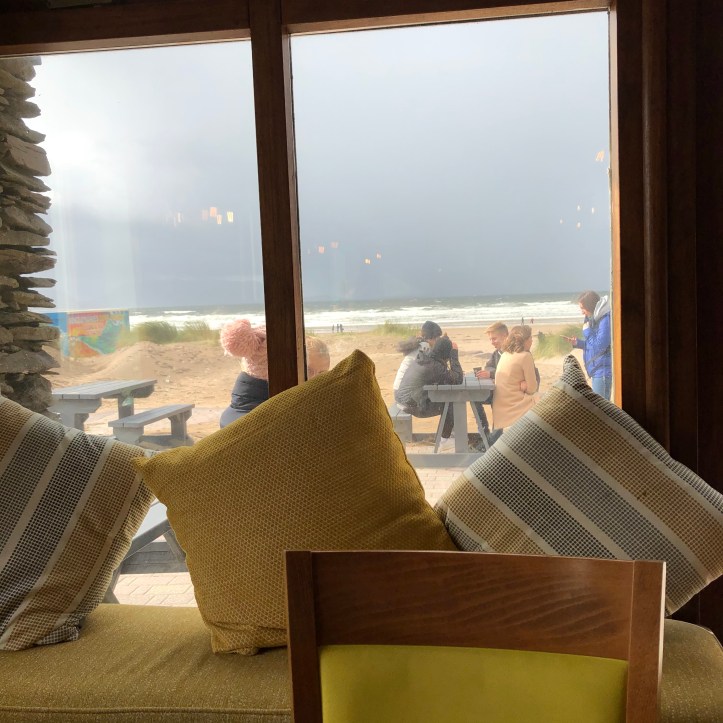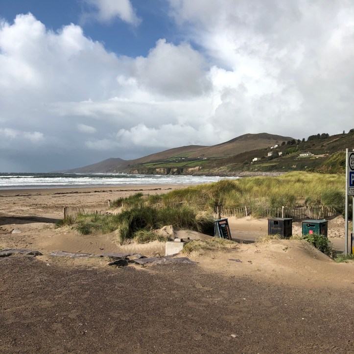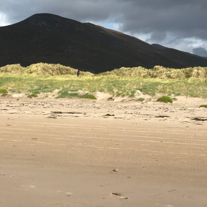 So I set off on my drive, along tiny, country roads even though I was on the famed “Wild Atlantic Way”, a series of roads that hug the coast of Ireland from southeast County Cork to far northwest County Donegal. It wasn’t long before I was hungry for lunch and ready to stretch my legs. I pulled of at Inch Strand (or beach). What a fantastic place to happen upon without planning! First food, then a long, long walk on what seemed to be an endless stretch of white sand, distant mountains, ever changing sky, grassy dunes. Light and dark shadows moving across all of it, with rain bursting out then sun, then rain again. Heaven.