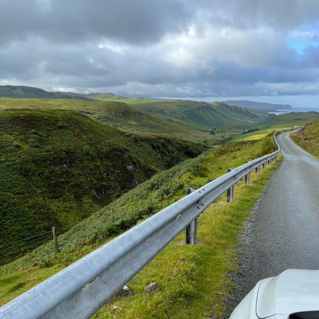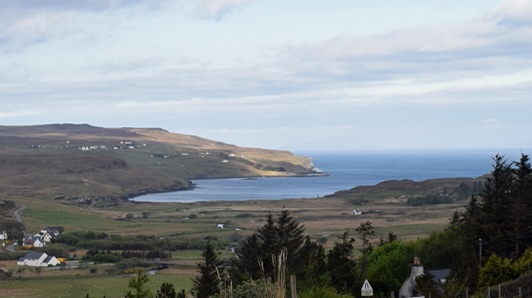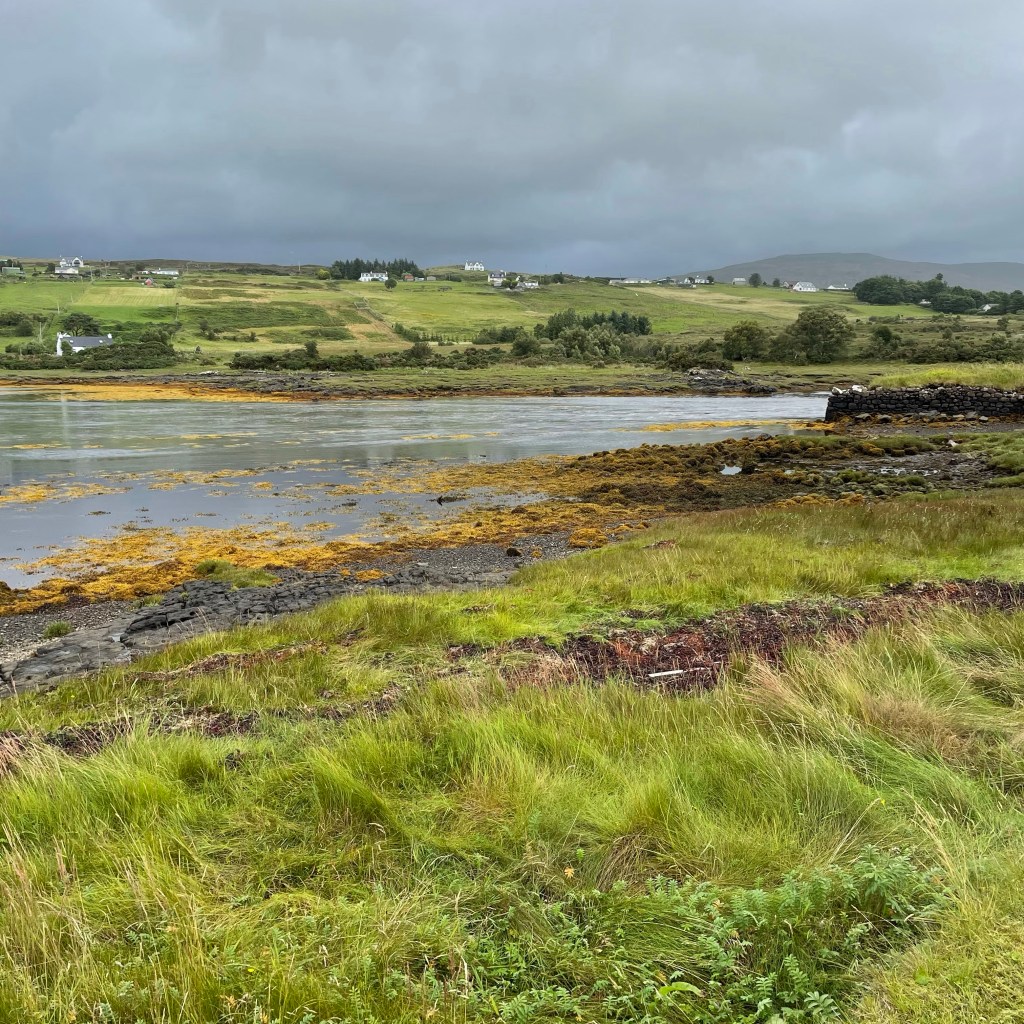 For those who haven’t traveled to the Isle of Sky, on the west coast of Scotland, I will try to describe it to you. It is rocky and rugged in form. But the land is covered with a soft sort of spongy green, comprised of bog plants like heather, sedge, bracken and moss. From a distance, everything appears soft and spongy. Close up, however, it’s often prickly and/or hiding knee deep mud. There are few trees. There are scattered towns – each a collection of houses, perhaps a Co-op (grocery), a pier, a town hall and a shop or two for visitors. For the most part, the built environment consists of “white houses” – croft homes built in the vernacular style. They stand out from the green like icebergs in the sea. Or like oversized sheep in the sweeping moorland meadows. You can drive for miles here seeing nothing but softly indulating hills. Then suddenly turn a corner, drop down a hill and a needle of seawater reaches for you, a scattering of houses and trees reaching up both sides of the steep shoreline edges.