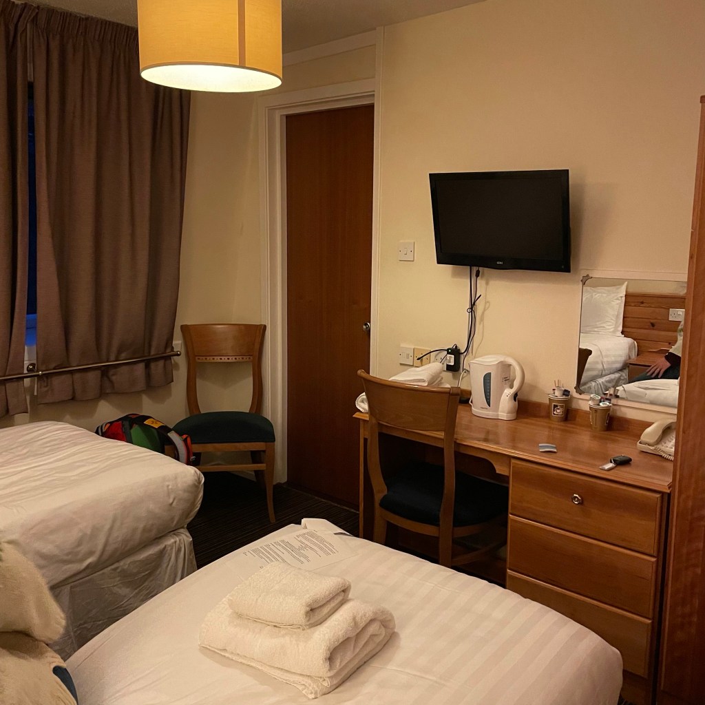 For those of you who know the Cuillin Hills hotel, you know how sumptuous it is. Tonight is decidedly not. We chuckle about it. In our tiny room.