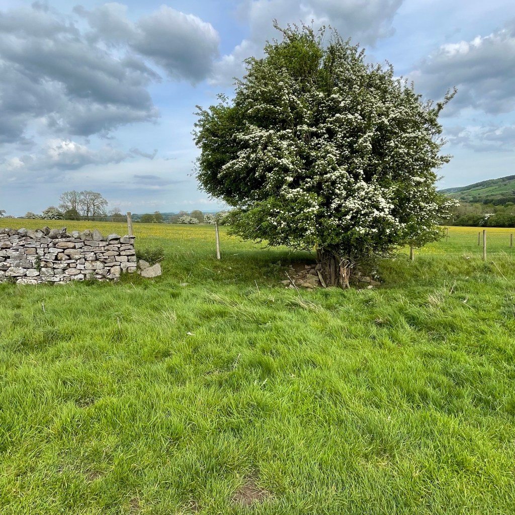 Stone walls, whitethorn and oak, miles of deep grass. Yorkshire, between Leyburn and Middleham.