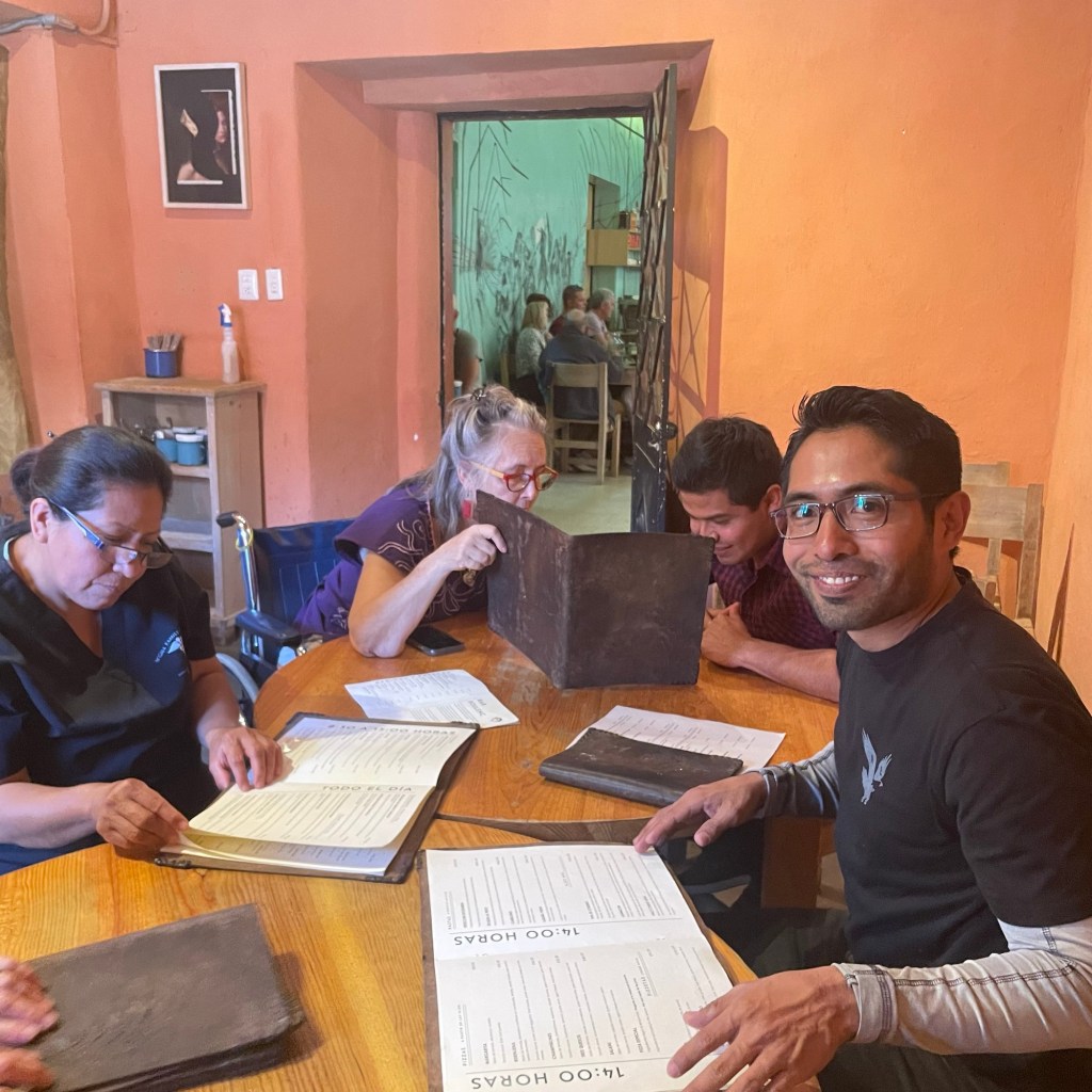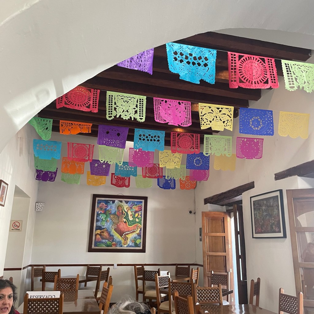 Day four in Oaxaca – my last full one. Yesterday was mostly packing up Janie’s condo and having a fantastic lunch out with folks who’ve been helping her through the broken ankle ordeal: her condo neighbors, her “home health” (of a sort) nurse, her doctor, her Spanish teacher and her fantastico driver/adopted son. I have to say, it’s not easy going out to lunch with several people you don’t know, in a loud restaurant, with multiple languages in play. But we did it. And it was outrageously fun!