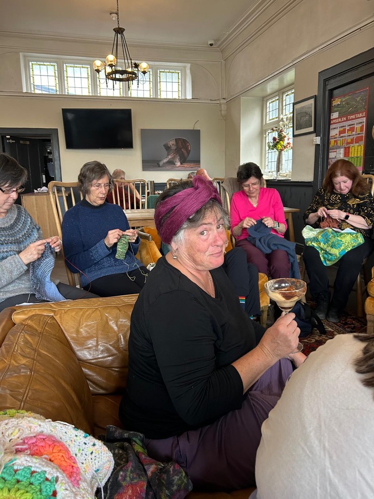 That’s me, wearing a skein of yarn on my head and having a drink instead of winding that skein into a ball. Sometimes it’s good to just relax and have a good time. You don’t ALWAYS have to be making something. And I was grateful to be among our Merry Band of Travelers (as I call them) to offset my low mood.