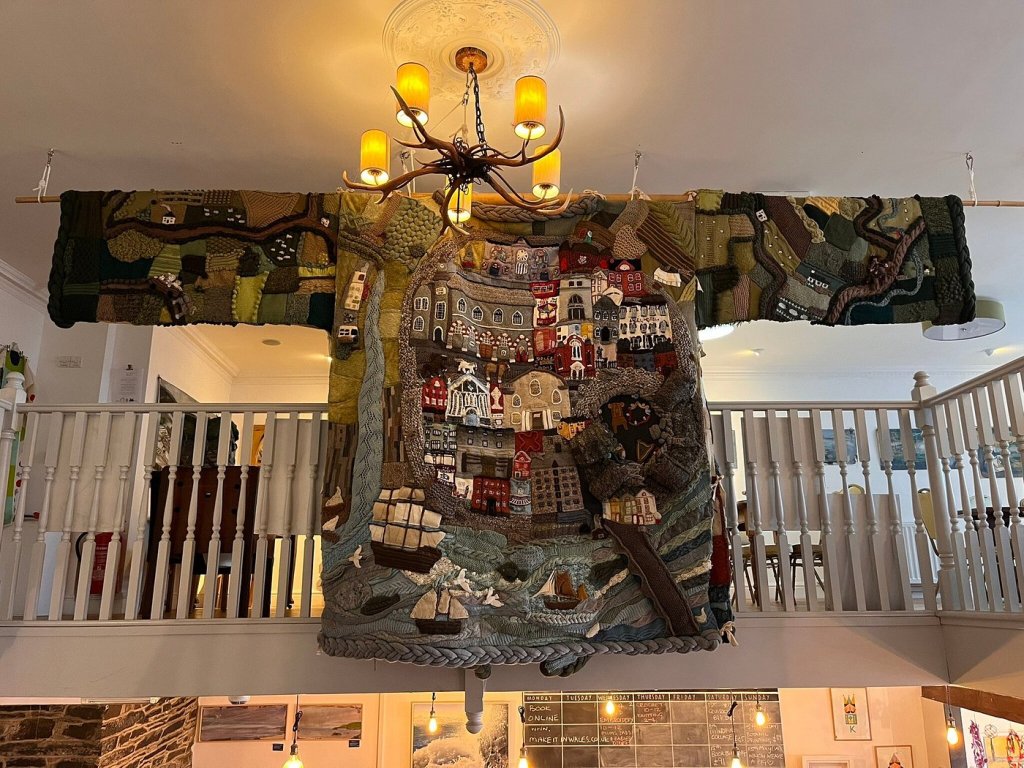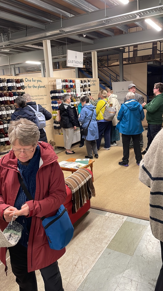 Oh my goodness, I just realized I lost a day there in my descriptions. When we first arrived at Druidstone, we immediately went into two hands-on workshops — one in weaving and one in wet felting. While that was going on, Colleen and I were wandering around the property, taking people’s luggage to their rooms and checking on things. Then I sat down to work for a while. The next morning, after breakfast, we actually continued with the second part of the workshops — and I worked again on my computer. So… I didn’t take any pictures of the group involved in their making adventures. I was also stressed out by some pieces of upcoming tours that were not coming together well and/or had to be changed altogether. (Surprise! The venue for your workshop the teacher was supposed to arrange has now announced they won’t be open! Find somewhere new, rearrange schedule on that day and next two days in order to make it all work! Ta da! Magic!) I think my head was still swimming in logistics when we drove north from Druidstone, on the Pembrokeshire coast, to Cardigan to see the giant cardigan (picture below, swiped from the internet) and on to Garthenor Organic.